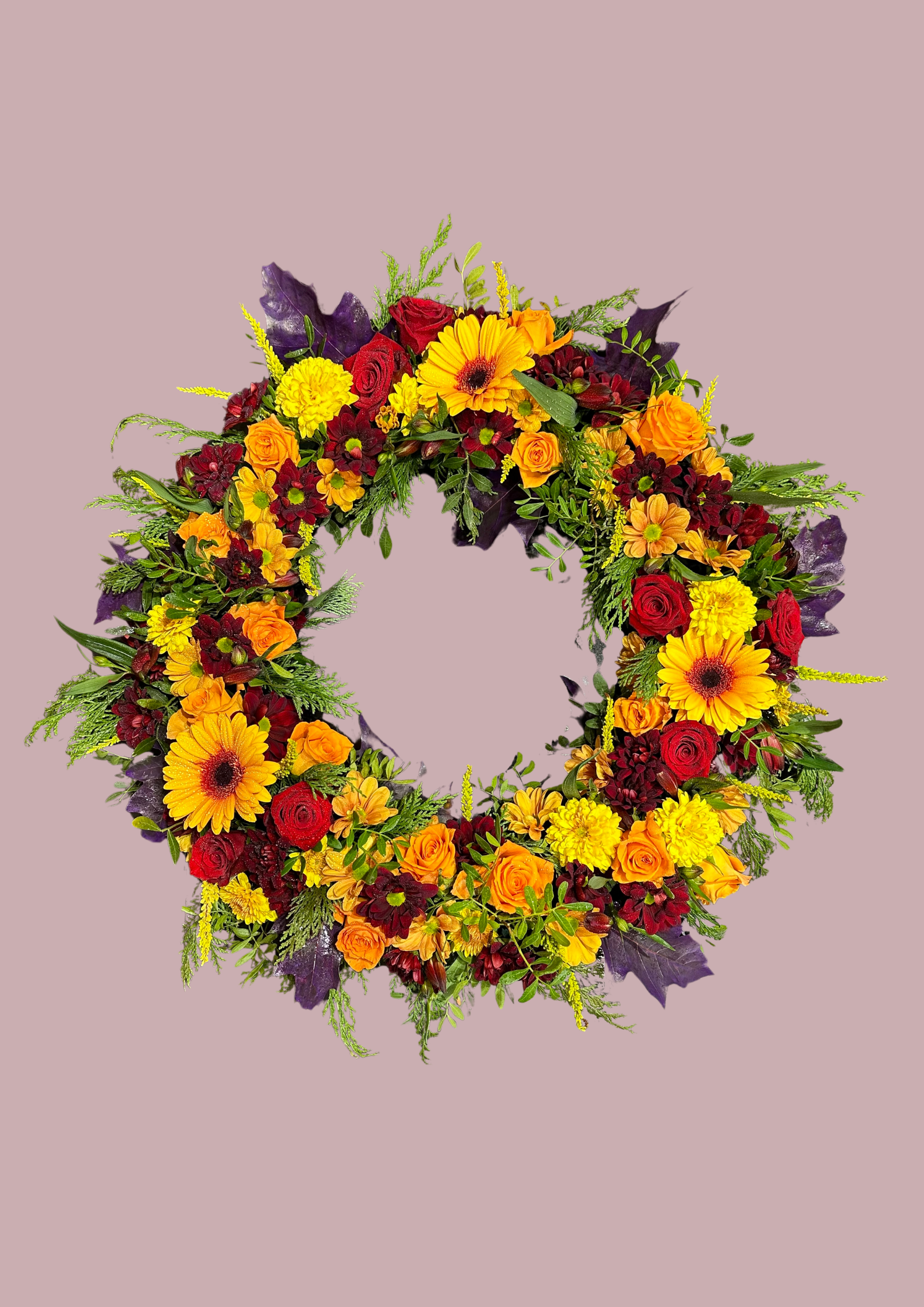 Fallegur og litríkur jarðarfarakrans sem endurspeglar hlýhug við kveðjustund.