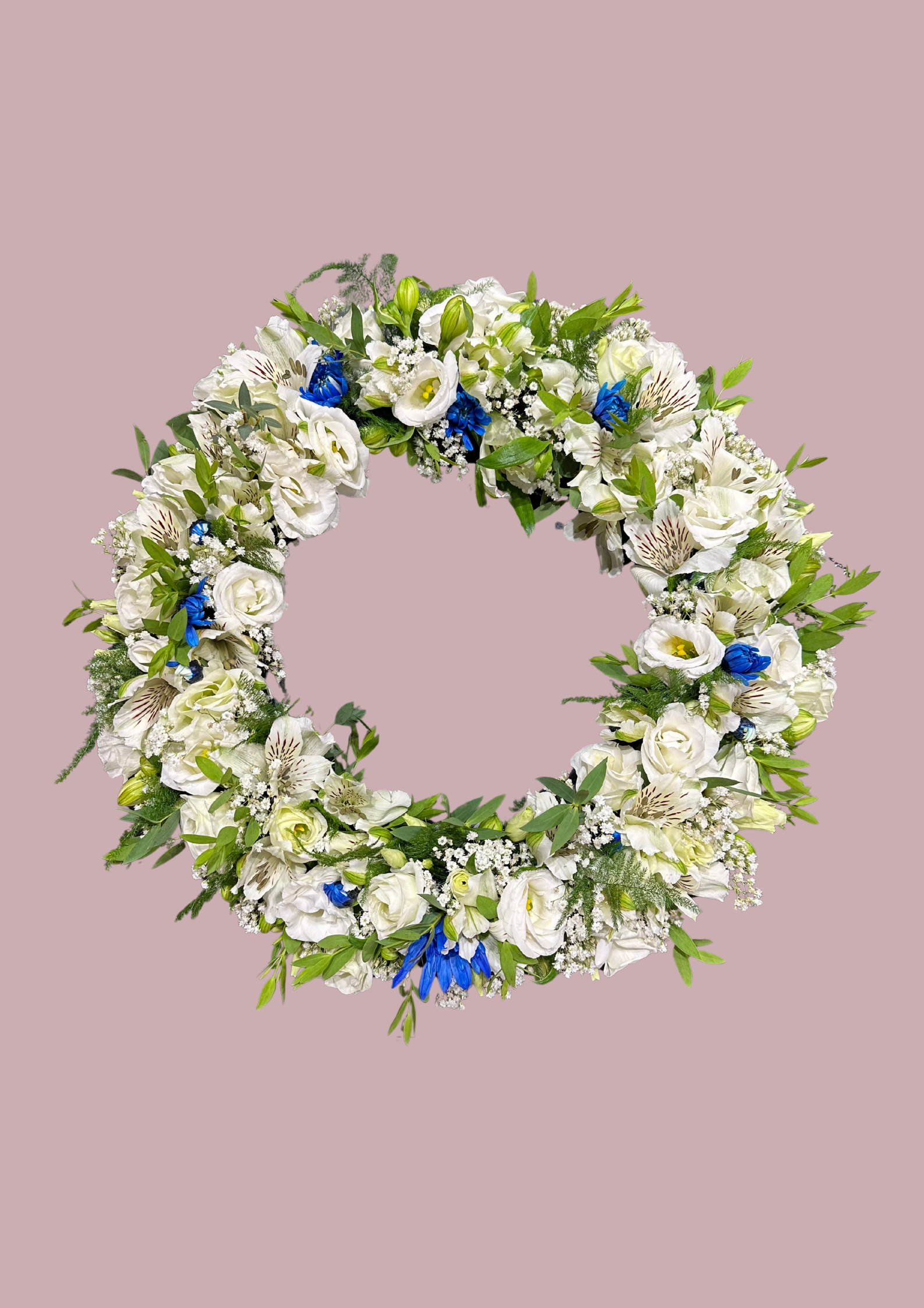 Hver krans er einstakt handverk. Hægt er að óska eftir ákveðnum blómum og litatónum og reynt er að verða að þeim óskum eins og unnt er.
