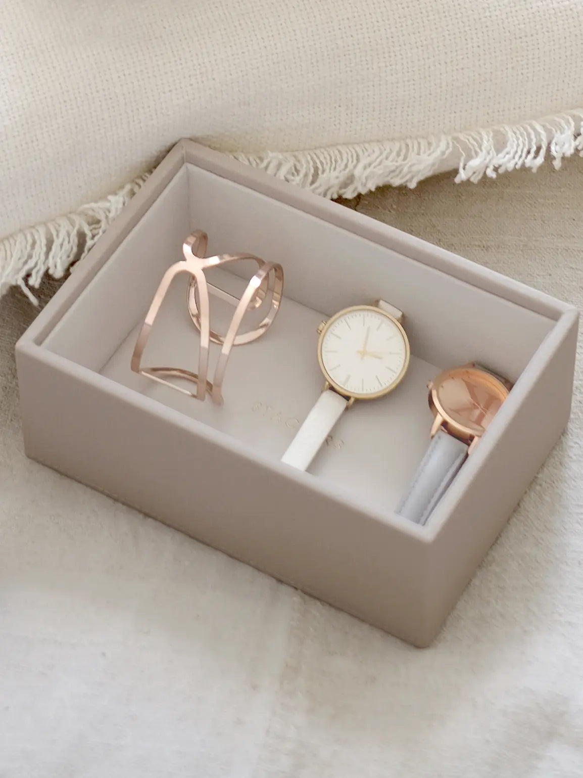 Þessi hæð er dýpri og sérhönnuð til að geyma stærri fylgihluti eins og úr, sólgleraugu, breið armbönd eða nælur. Hægt er að bæta henni við Stackers mini skartgripaboxið eða nota hana eina og sér á snyrtiborði eða í skúffu.